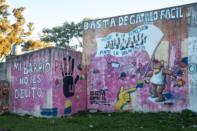 Murales realizados por el Colectivo contra el Gatillo Fácil. Diagonal 113 y 62 ( Víctor González); 120 y 40; Diagonal 80 y 115 (Omar Cigaran); y 22 y 71, (Mauricio Andrada e Ismael Perussatto).
