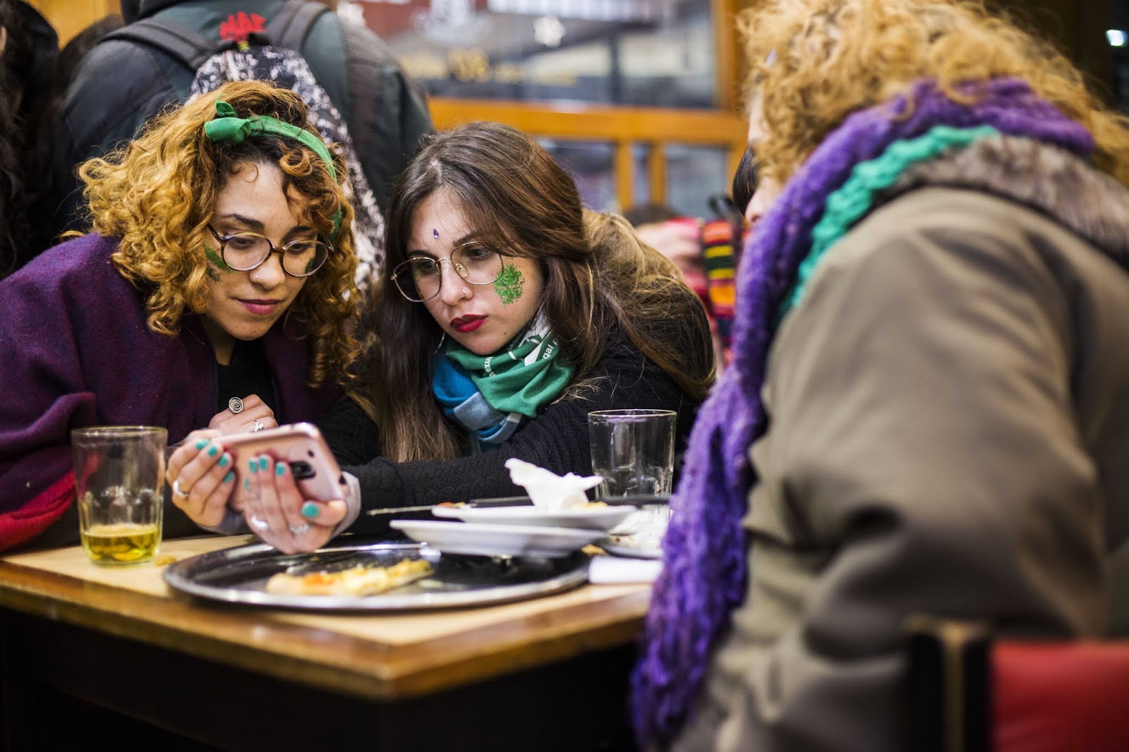 El glitter es el protagonista de la jornada: purpurina verde y violeta que maquilla párpados y decora las mejillas de les pibes. De a ratos, algune canta a los gritos, “Si no hay aborto legal…” y la mayoría responde: “Qué quilombo que se va a armar”.