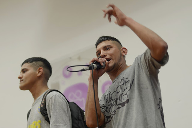 «Estamos en la esquina pero somos buena gente, nosotros tenemos gorra y no somos delincuentes» cantan Fernando y Tote (Las Quintas Potencia) después de participar del taller de rap.