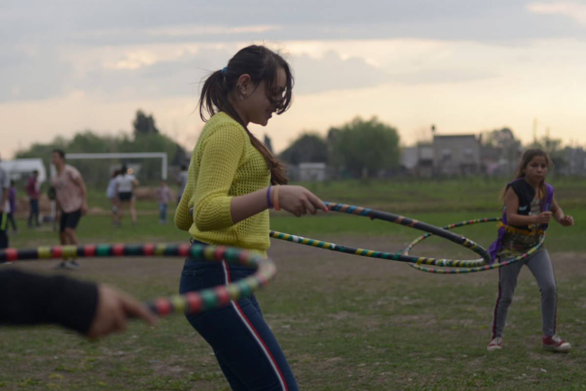 El encuentro lo organizaron lxs propixs pibxs. Gabi (El Hormiguero Cultural, Los Hornos) cuelga las banderas, coordina juegos y talleres y lo hace todo, prácticamente, sin dejar de abrazar el bombo murguero.