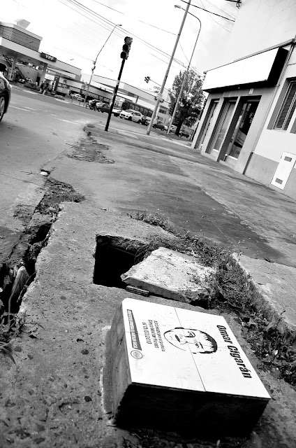 A la derecha de Omar, agazapado entre las piernas de los demás, asoma Javier, el Pimienta. Es el único que está descalzo y en cuero; tiene el pelo teñido de un rubio fluorescente. De todos los pibes de la Banda de la Frazada es el único que realmente vive en la calle. También tiene familia: una que decidió abandonar a los cinco años y a la que sólo regresa muy de vez en cuando. El Pimienta empezó a drogarse desde tan temprano que ahora ya no le hace asco a nada. Poxiran, pastillas, merca y alcohol, todo entra y sale de su organismo como si fuera un pozo cloacal donde los tranzas descartan su droga más rancia. Se le nota en el rostro, un aura rosada contorneando sus ojos, las facciones tiesas y avejentadas. Tiene un cigarro prendido en la boca y con la mano derecha hace ademán de un fierro. En la otra tiene su juguete; él también estampó su nombre, “Javi”, con letras gruesas, amarillas. Al lado dibujó los cinco puntos tumberos.