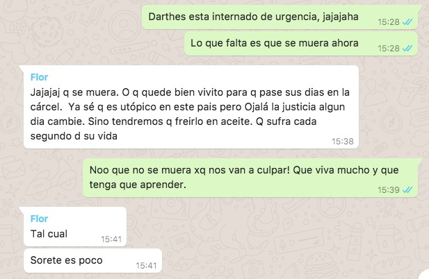 – Flor: Jajajaj q se muera. O q quede bien vivito para q pase sus dias en la cárcel. Ya sé q es utópico en este pais pero ojalá la justicia algun dia cambie. Sino tendremos q freirlo en aceite. Q sufra cada segundo d su vida.
