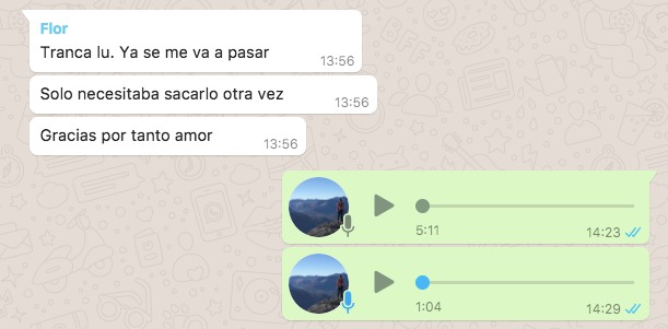 Audio de 5:11 de Juli: Hermosa. Me movilizó un montón todo lo que decís y todo lo que está pasando. Me parece que la única manera que tenemos y la estrategia que estamos encontrando en este horror es poder hablarlo. Poder hablarlo entre interlocutores válidos. Que también eso es un buen ejercicio a hacer entre nosotras. Entre tanta mierda del mundo, está bueno también poder hacer una selección ahí; y decir qué cosas me suman y qué cosas no me suman y de quiénes. De qué manera. Yo estoy aprendiendo eso. A separar. Mi estabilidad emocional, mi fortalezas y mi vida, se la encargo a esta red. Red de amigas, red de amigos, de amigues, red de medios; quien chonga sea.