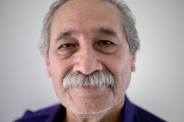 “El hermanito” posa con la frente en alto y los ojos radiantes, erguido, tan quieto que parece esculpido. Una sonrisa detrás de los bigotes blancos, su traje de operario de Electrónica repleto de medallas de honor, un orgullo que se siente en el aire.