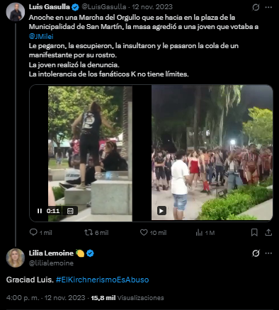 Hace apenas semanas, un hecho similar ocurrió en San Miguel: durante la Marcha del Orgullo, militantes de “Las Fuerzas del Cielo” comenzaron a entrevistar asistentes y mantuvieron un cruce con lxs activistas. La discusión tenía un evidente trasfondo político: confrontaban sobre la marcha y sus consignas. Luego, dos activistas LGBT+ fueron amenazados y doxeados: fotos de sus domicilios circularon con mensajes de odio y violencia; al punto que desconocidos los fueron a buscar a sus trabajos.