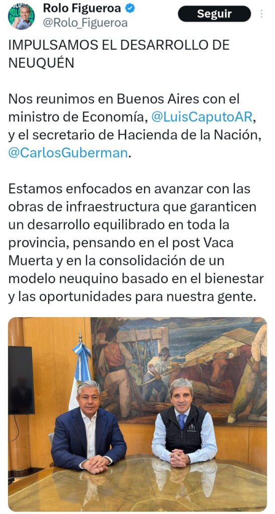 “Estamos enfocados en avanzar con las obras de infraestructura que garanticen un desarrollo equilibrado en toda la provincia, pensando en el post Vaca Muerta y en la consolidación de un modelo neuquino basado en el bienestar y las oportunidades para nuestra gente”- declaraba reunido con el Ministro de Economía, Luis Caputo– Rolando Figueroa, el gobernador de la provincia que -adherida al RIGI- decretó (decreto N°1303) la emergencia hídrica, agropecuaria, social y productiva a la par que habilitó la explotación a través de fracking de la principal cuenca hídrica no limítrofe más importante del país, conformada por el río Limay, el río Neuquén y el Río Negro.
