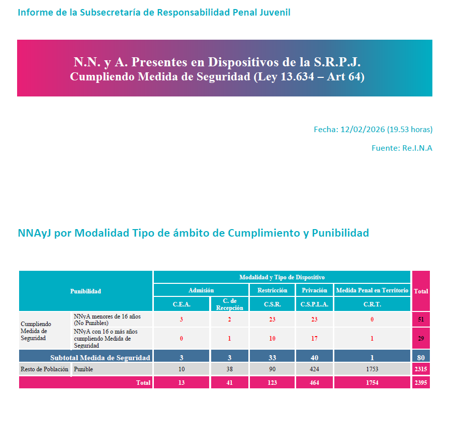 Sin embargo, en el último año, en Provincia de Bueno Aires hubo un crecimiento exponencial del número de adolescentes de 12, 13, 14 o 15 años privados de su libertad en diferentes centros de “menores”: Un mes después del crimen de Kim Gómez, en marzo de 2025 llegaron a ser 102 y según los últimos datos de la Subsecretaría bonaerense de Responsabilidad Penal Juvenil a los que pudo acceder Perycia, en la actualidad hay 80 (51 menores de 16, y 29 que cumplieron 16 privados de su libertad). Es el doble del promedio histórico de 30 o 40 en todo el territorio bonaerense.